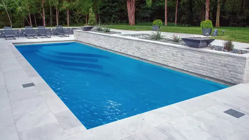 One of our most flexible pool designs that also provides a wide variety of sizes to fit almost any backyard paradise. Kids enjoy the variety of steps and bench seating while parents enjoy having a full swimming channel within the classic rectangle pool style.